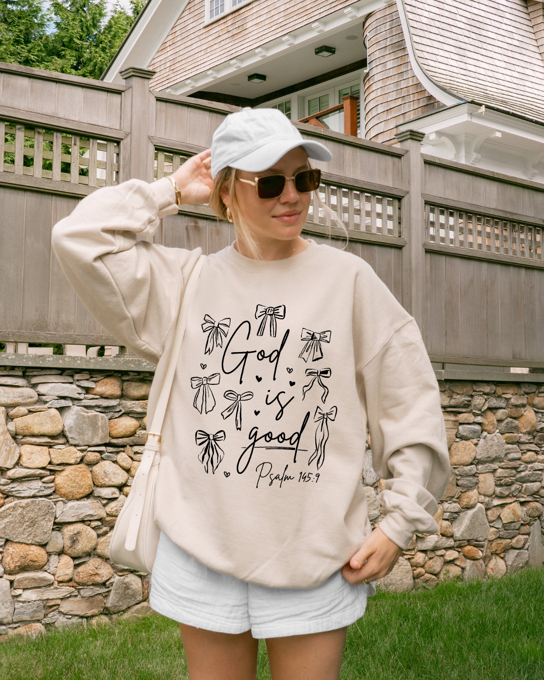 Soft, simple, and full of meaning — this cozy crewneck is a gentle reminder of truth you can carry with you every day. Featuring a hand-drawn bow design surrounding the words “God is good” with the verse reference Psalm 145:9, this piece blends faith and femininity in the most wearable way.