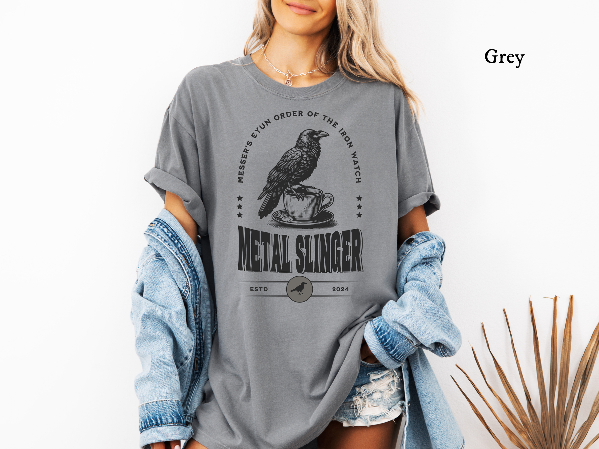 Show your allegiance to the shadows of Metal Slinger with the Messer’s Eyun Order of the Iron Watch tee. Featuring the commanding Eyun bird perched above a steaming cup, this design captures the ominous, watchful presence tied to Messer’s power and the dark lore of the series.